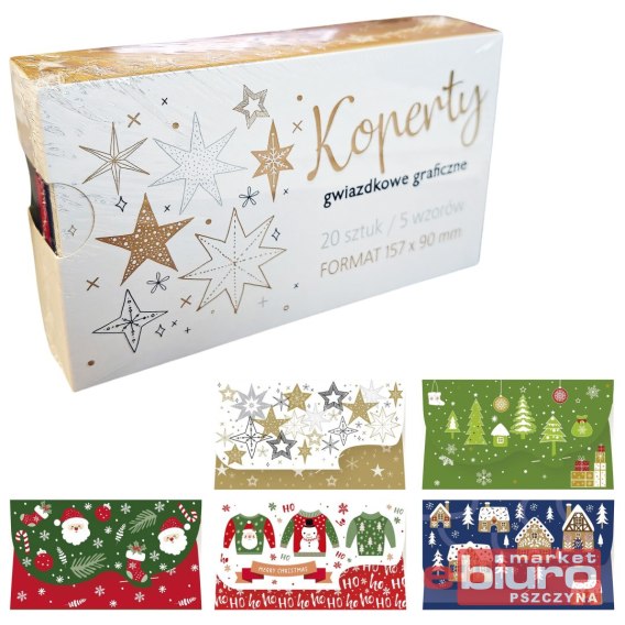 Zestaw 20 kolorowych kopert ze świątecznymi wzorami w prostokątnym formacie w rozmiarze 157x90mm.
